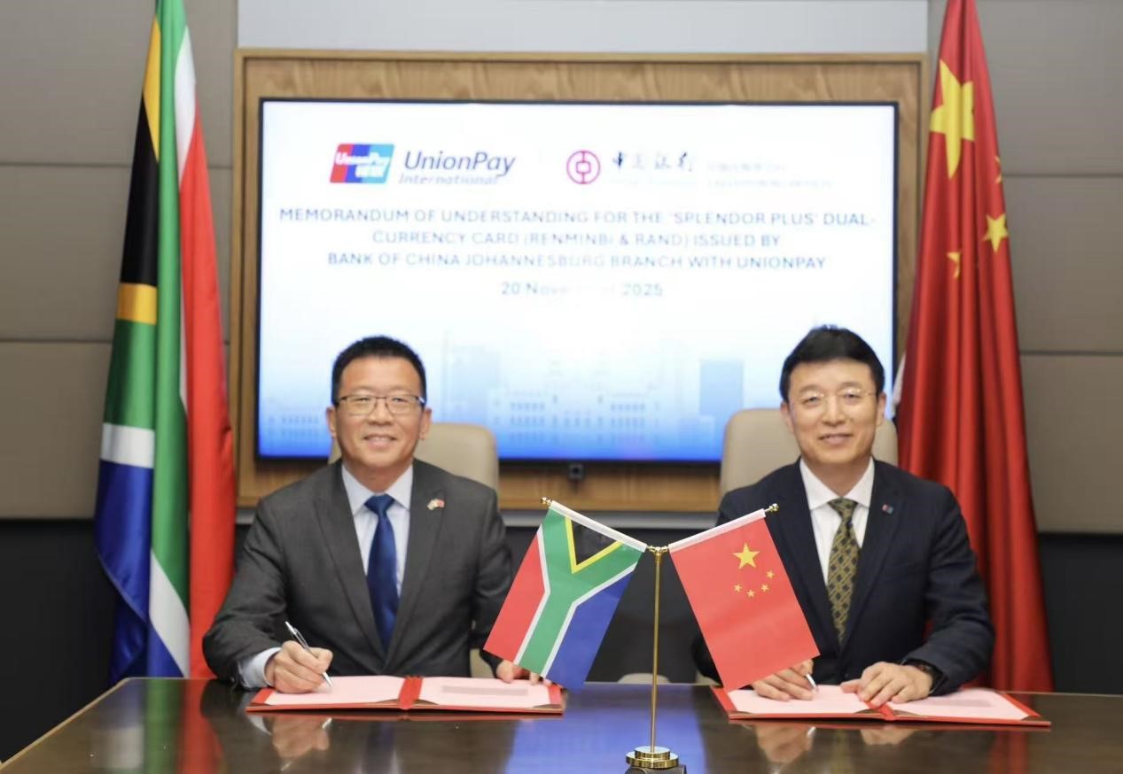 11月20日,銀聯國際與中國銀行約翰內斯堡分行聯合宣布,將在南非首次推出銀聯錦繡中華卡,這也是銀聯與中行攜手在境外第11個國家和地區發行該系列卡片。在中國南非兩國央行行長見證下,中國銀聯董事長兼銀聯國際董事長董俊峰與中國銀行約翰內斯堡分行行長張朝陽簽署合作備忘錄。