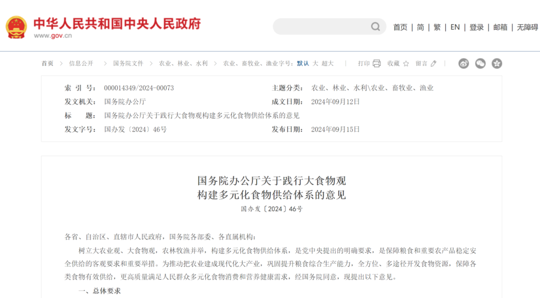 日前,經國務院同意,國務院辦公廳印發《關于踐行大食物觀構建多元化食物供給體系的意見》。