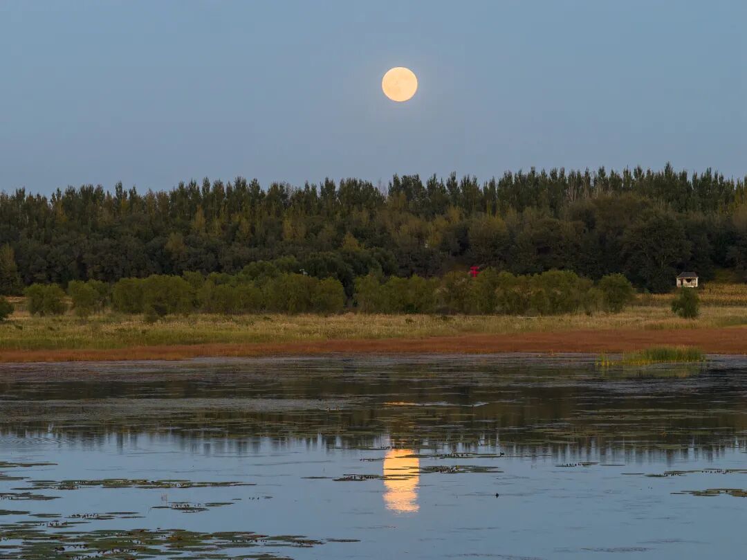 △2025年10月7日,遼寧沈陽,超級月亮現身康平縣臥龍湖上空。