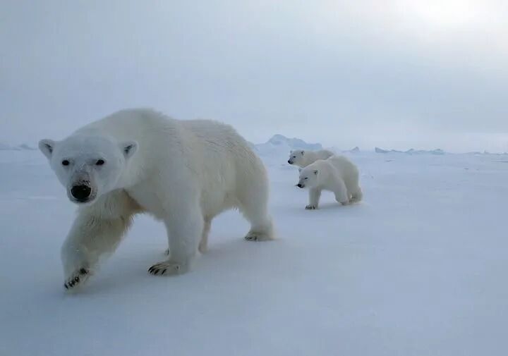 北冰洋高緯度地區的北極熊一家三口(2025年8月31日攝)。