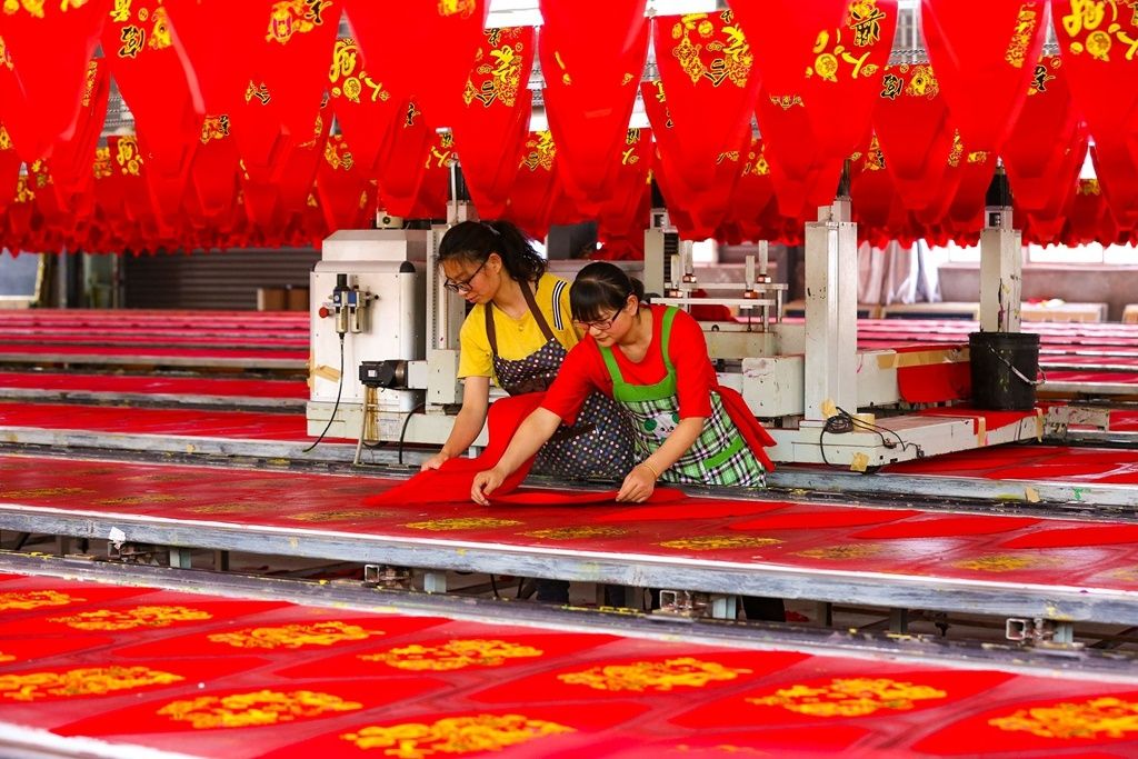 6月19日,五河縣頭鋪鎮(zhèn)郜臺(tái)村一家企業(yè)的原料加工車間,紅彤彤的燈籠制品映紅了工人臉頰。
