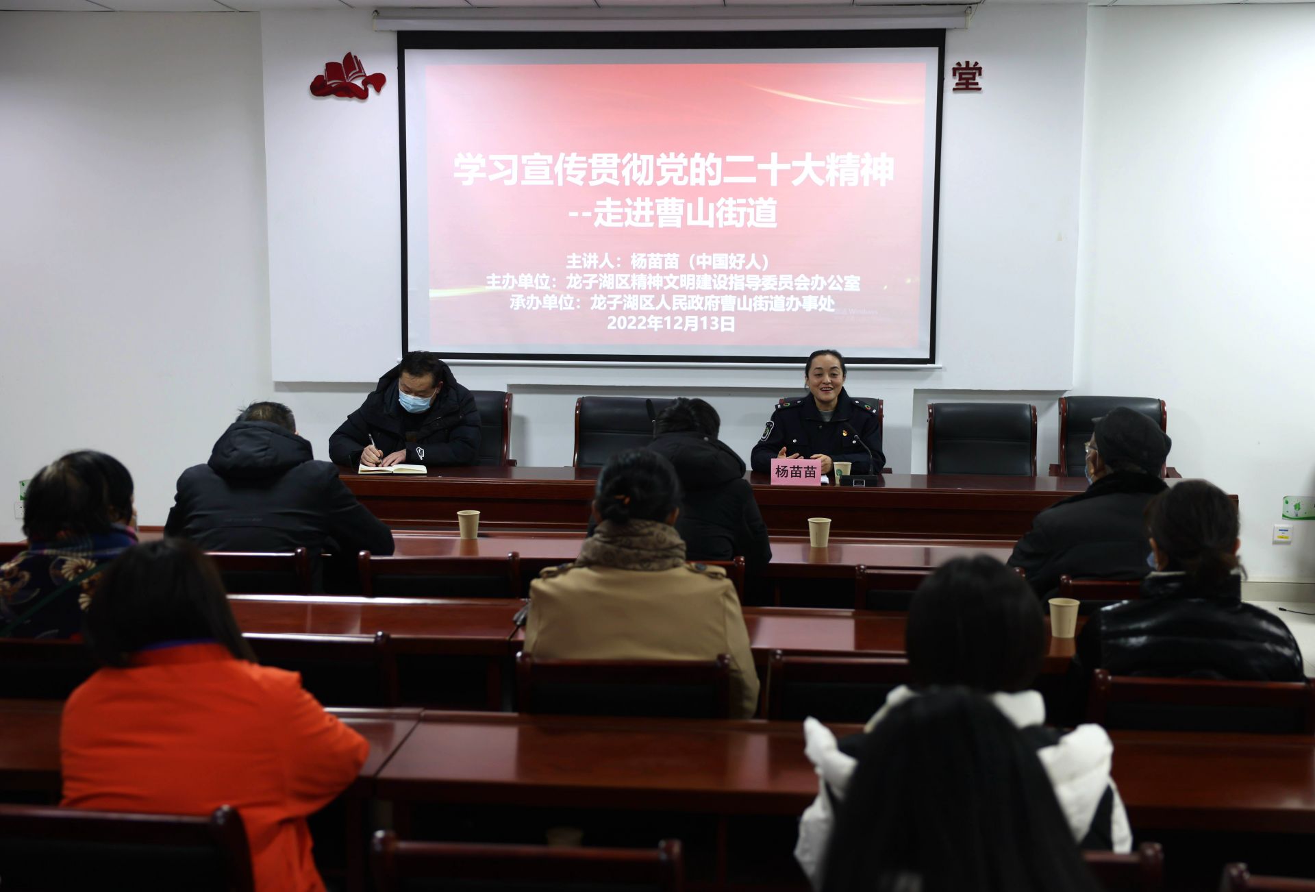 12月13日,中國好人、107路公交車駕駛員楊苗苗在曹山街道新時代文明實踐大講堂向社區居民宣講黨的二十大精神相關內容。當日,由龍子湖區文明辦主辦,曹山街道辦事處承辦的“學習宣傳貫徹黨的二十大精神”——走進曹山街道在此舉行。