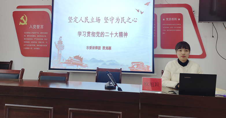 3月21日上午,學習貫徹黨的二十大精神“社科巡講”活動走進秦集鎮山香村,市委講師團中心組學習室一級科員歐旭穎應邀作宣講報告,山香村村兩委干部、黨員、網格員等聆聽報告。