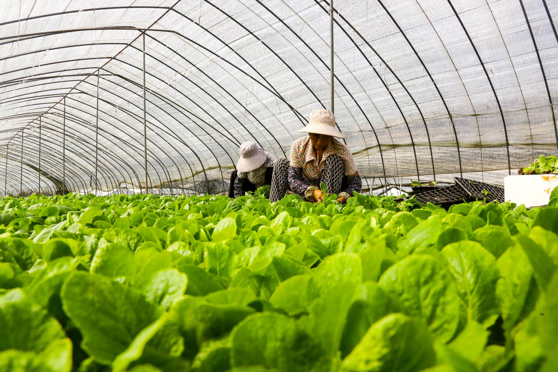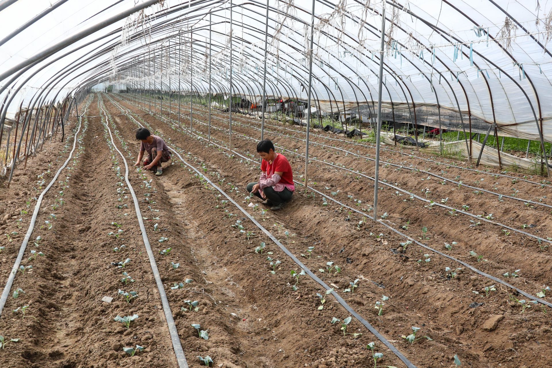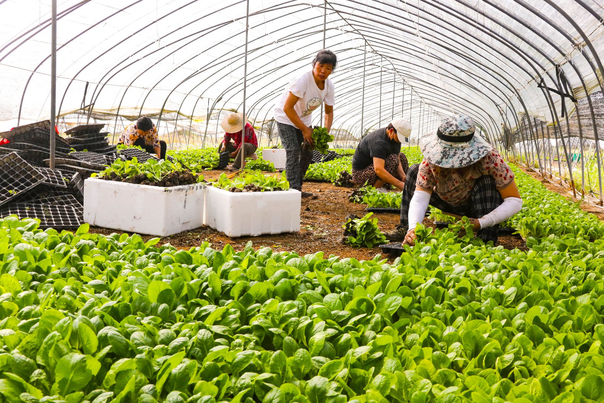 2023年9月8日在安徽省蚌埠市五河縣頭鋪鎮現代農業示范園內,一畦畦白菜苗一片綠油油的景象,工人們正在忙碌的起白菜苗準備種植,出售。