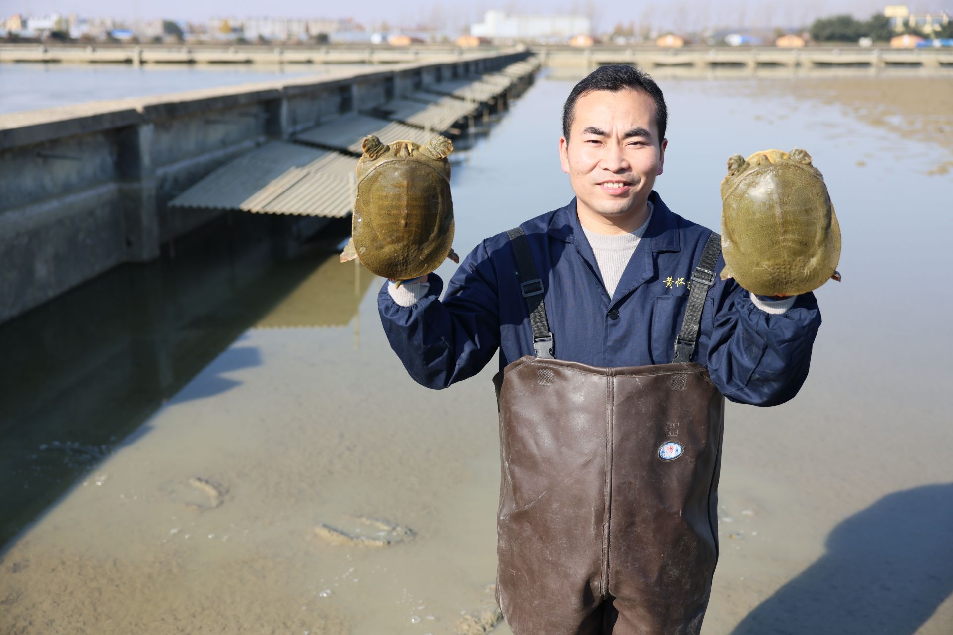 12月1日,安徽省黃淮甲魚良種繁育有限公司員工展示自家的甲魚。