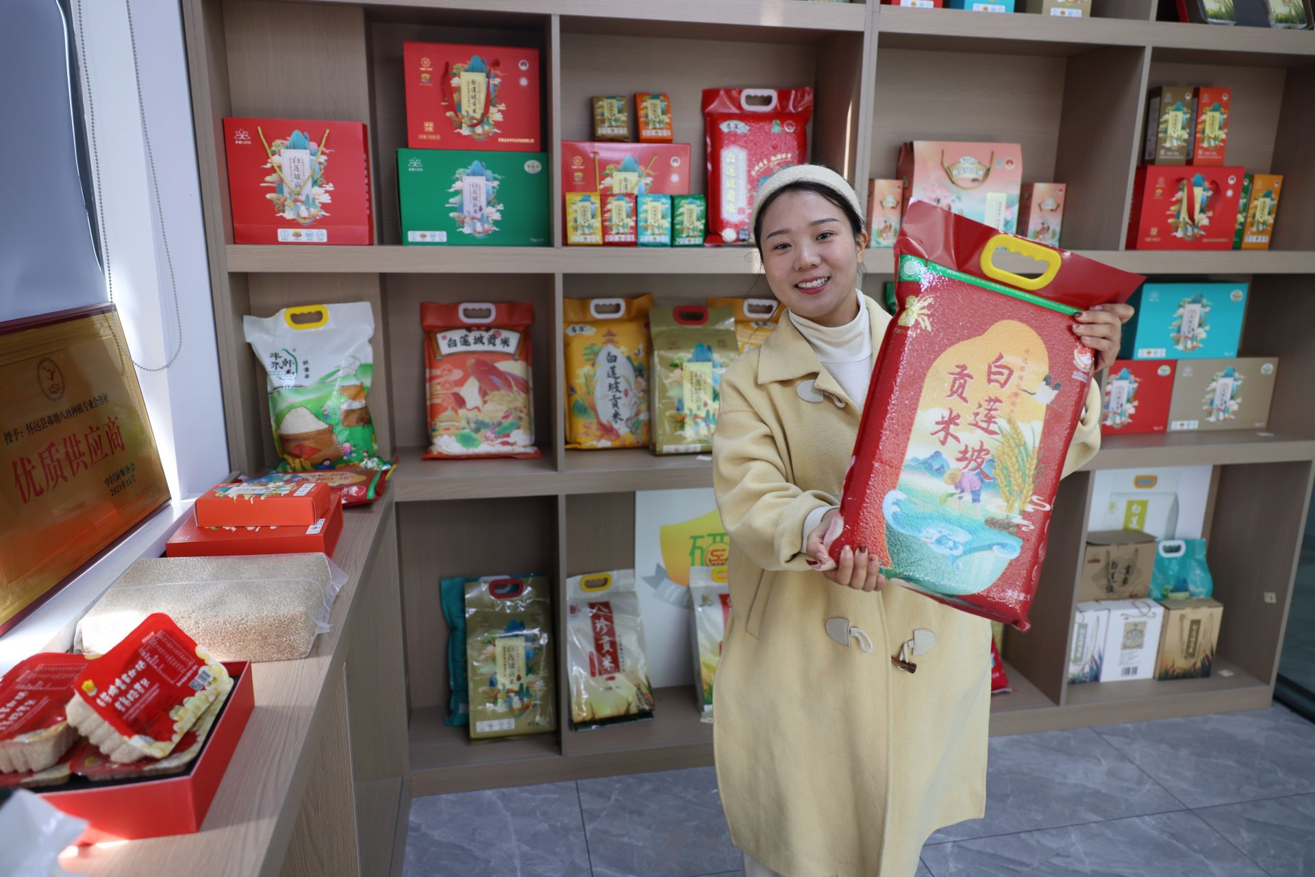 12月6日,懷遠縣百姓糧油有限公司員工向記者展示白蓮坡貢米產(chǎn)品。