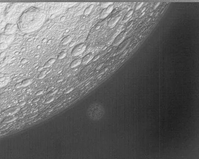 2024年4月8日,天都二號拍攝成像。波長為8至14微米的遠紅外譜段月球成像數據,背景中較小的天體為地球。(國家航天局供圖)