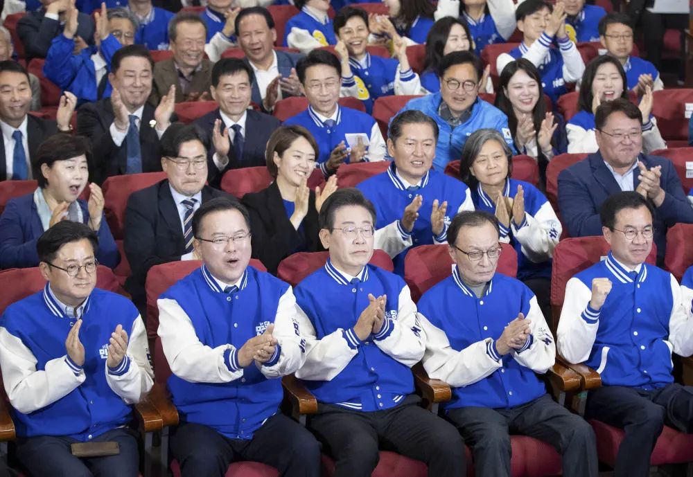 4月10日,在韓國首爾,韓國最大在野黨共同民主黨黨首李在明(前排中)與共同民主黨領導層共同慶祝出口民調結果大幅領先。(新華社記者 姚琪琳 攝)