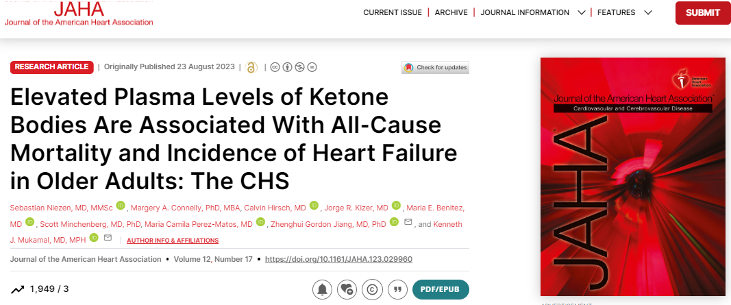2023年8月,哈佛醫(yī)學(xué)院的研究人員在《美國心臟協(xié)會雜志》發(fā)表的一研究發(fā)現(xiàn):血漿酮體水平升高與心臟衰竭、全因死亡風(fēng)險升高有關(guān)。[2]