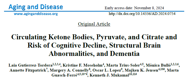 2024年11月8日,丹麥哥本哈根大學(xué)的研究人員在《衰老與疾病》期刊上發(fā)表的一項研究發(fā)現(xiàn):較高的血酮水平,尤其是β-羥基丁酸(酮體的一部分)水平較高,與加速大腦認(rèn)知衰退和增加癡呆死亡率相關(guān)。[1]
