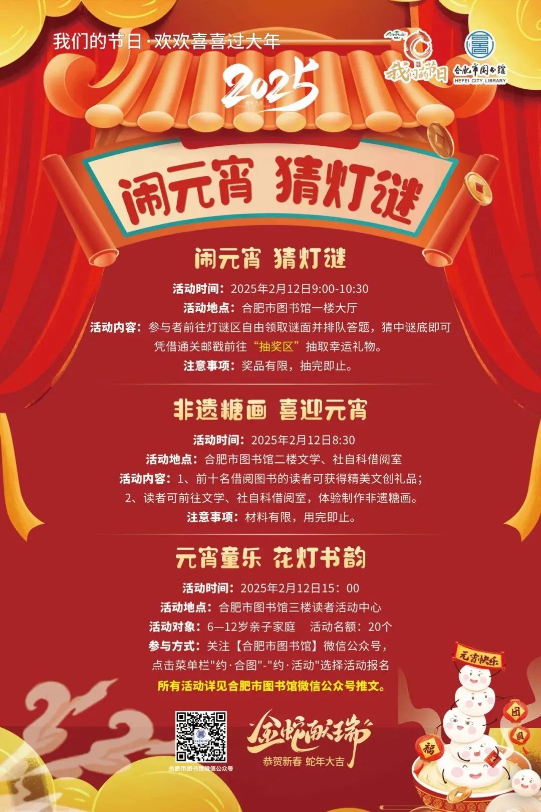 元宵節期間,合肥市圖書館將開展“喜鬧元宵 謎醉人間”線上活動;“鬧元宵 猜燈謎”“我們的節日·元宵節”以及“非遺糖畫 喜迎元宵”等線下活動,大家一起做花燈、猜燈謎,線上線下共度快樂元宵!