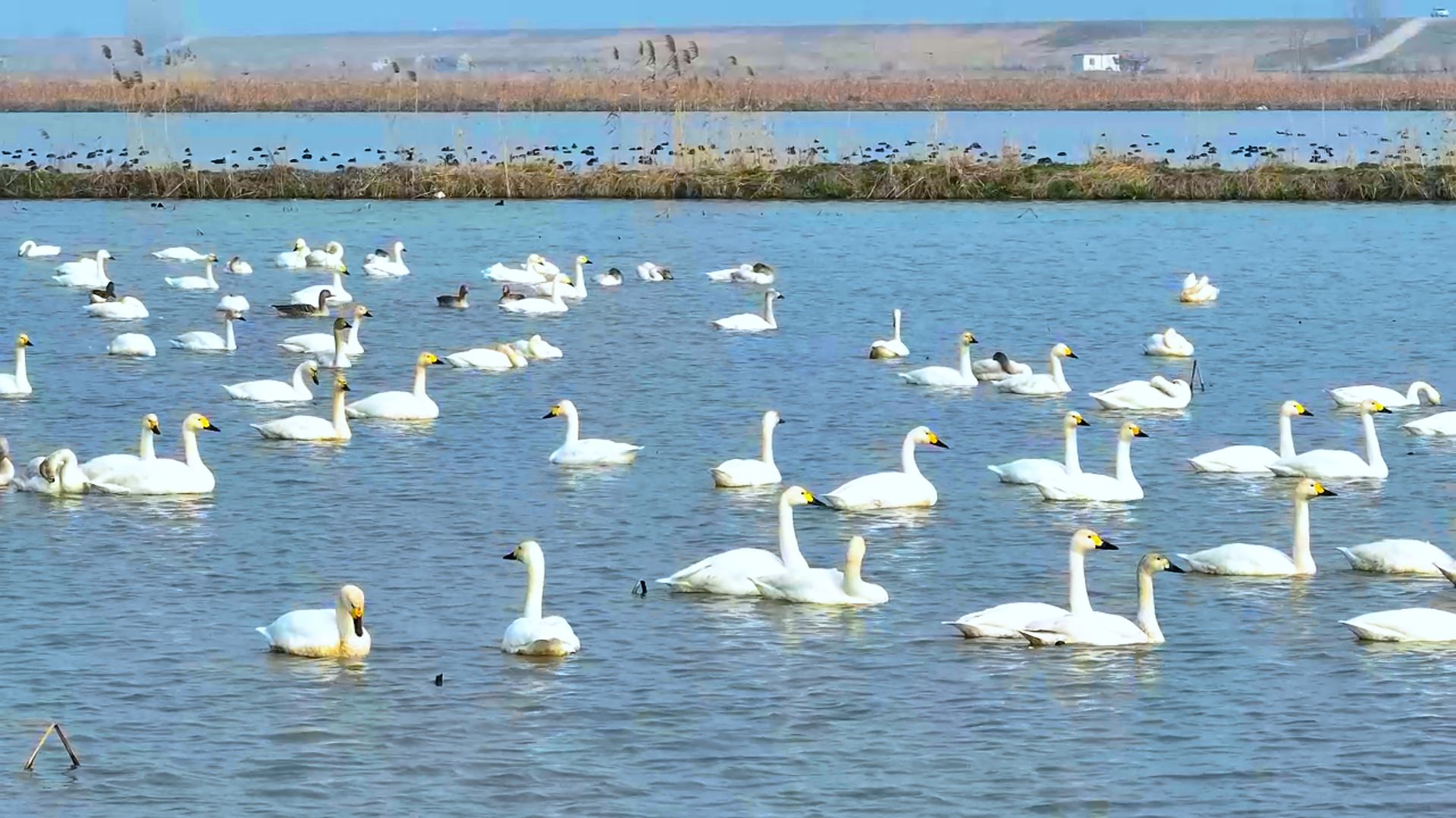 乍暖還寒之時,清晨五點,挖藕人老錢裹著厚厚的棉襖,蹲守在藕塘邊的簡陋房屋內。不遠處,白天鵝的聲聲嘶鳴劃破凌晨的寂靜。“這些‘大嗓門’客人白天黑夜都在叫,給這片土地增添了無限的生機!”老錢說。