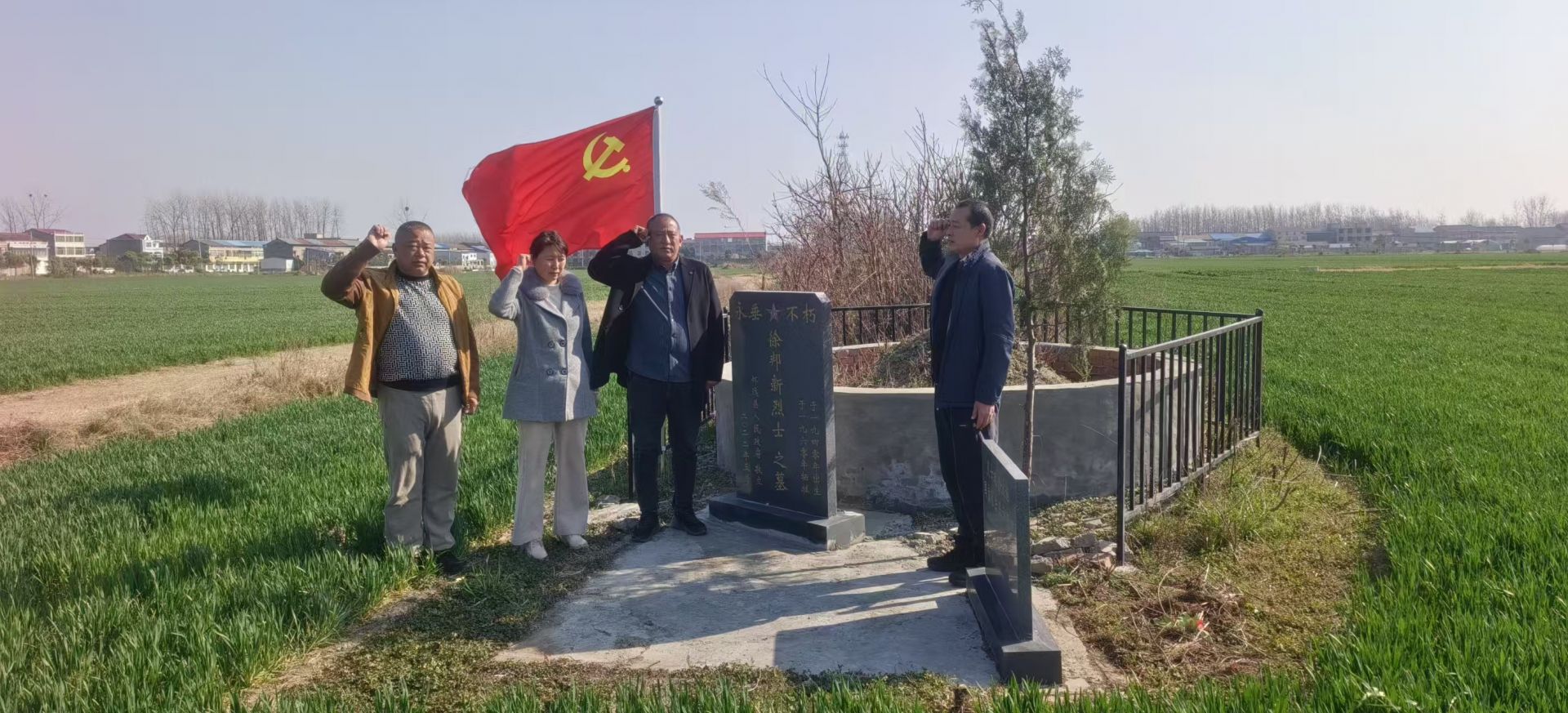 春風送暖,陽光明媚。在村黨支部書記崔鋒的帶領(lǐng)下,高莊村兩委干部來到位于高莊西部麥田的徐邦新烈士墓地,與他進行跨越時空的心靈交流和精神碰撞。村干部們向徐邦新烈士敬獻鮮花,寄托對英雄的無盡哀思和無限敬仰。在鮮紅的黨旗下,重溫入黨誓詞,決心在徐邦新烈士的精神鼓舞下,擔負起建設(shè)高莊、振興高莊的時代重任。