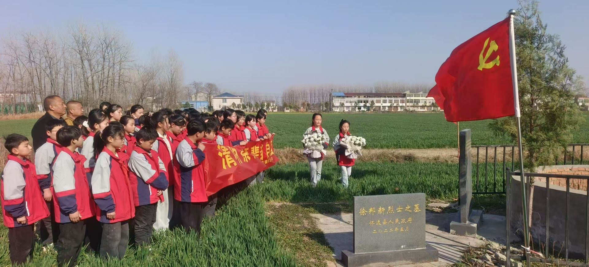 徐邦新烈士的事跡就是愛國主義和革命英雄主義的生動教材。為了激發(fā)孩子們的家國情懷,高莊小學的師生們擎著鮮紅的少先隊隊旗,排列著整齊的隊伍,來到徐邦新烈士的墓地,傾聽村黨支部書記崔鋒講述烈士的事跡,向烈士默哀致敬,在墓碑前進行莊嚴宣誓。學生代表發(fā)言,表達了孩子們立志為振興中華而發(fā)奮讀書、成長成才的共同心聲。