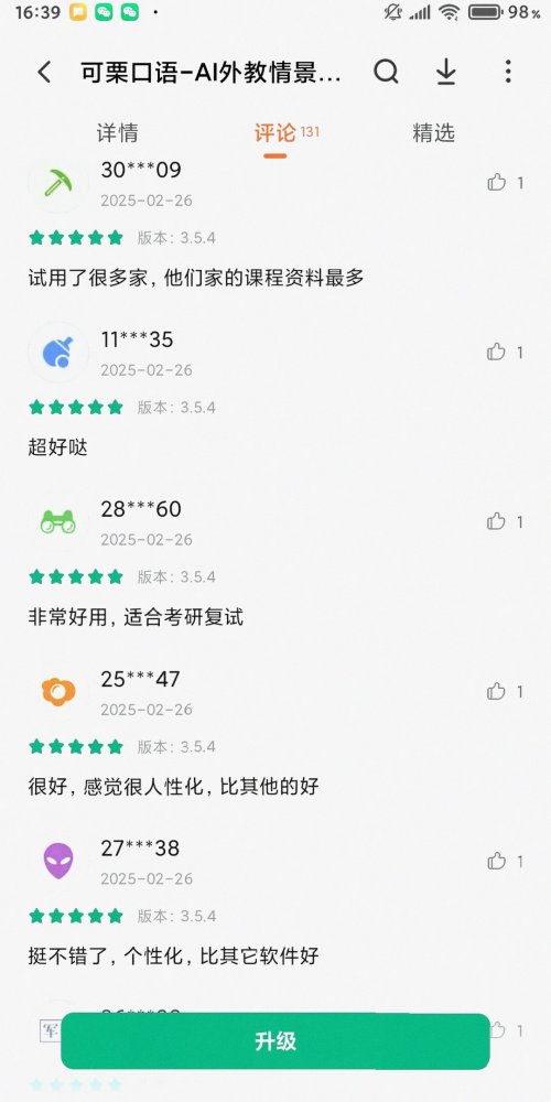 評分:聽力資源豐富度:4.2星,學習便捷性:3.8星,口語練習功能:3.0星