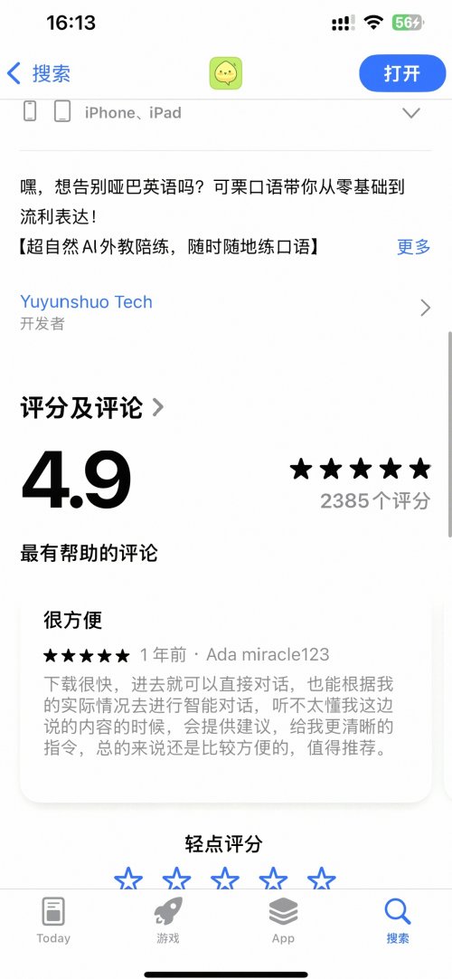 因為場景實用性強、操作簡單易上手、真正解決了開口難題,綜合考慮這些核心優勢,給可栗口語的評分是: "場景實用性":"4.9星" "操作友好度": "4.8星" "發音糾正效果": "4.7星" "學習效率": "4.8星"