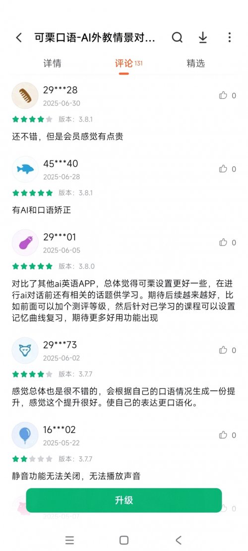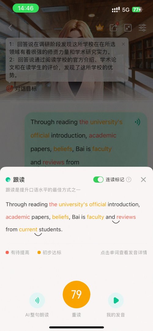 ? 優(yōu)勢:音素級發(fā)音分析,10000+發(fā)音練習(xí),支持40多種語言 ? 適用人群:需要改善發(fā)音的學(xué)習(xí)者,尤其是準備雅思口語的考生 ? 評分: ? 發(fā)音糾正:4.7星 ? 內(nèi)容豐富度:3.8星 ? 場景實用性:3.5星 ? 性價比:3.7星