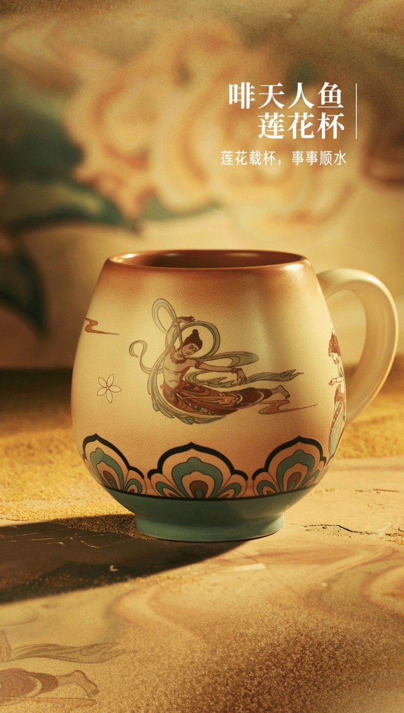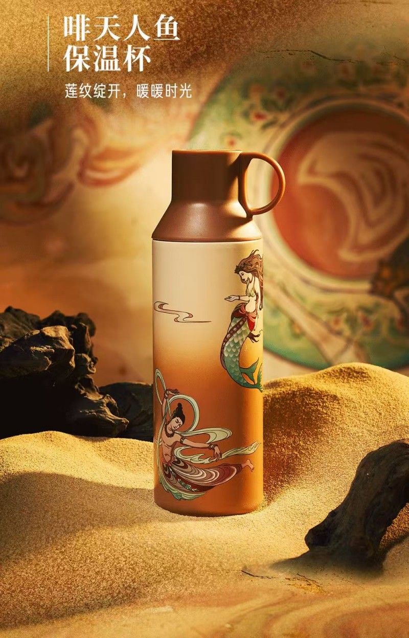 聯(lián)名馬克杯及保溫杯:杯身設(shè)計展現(xiàn)了敦煌飛天與塞壬女神的邂逅場景,融合了飛天飄帶、陀螺花與咖啡花等圖案,整體采用敦煌壁畫的復(fù)古色調(diào),握在手中仿佛捧起一幅流動的壁畫。