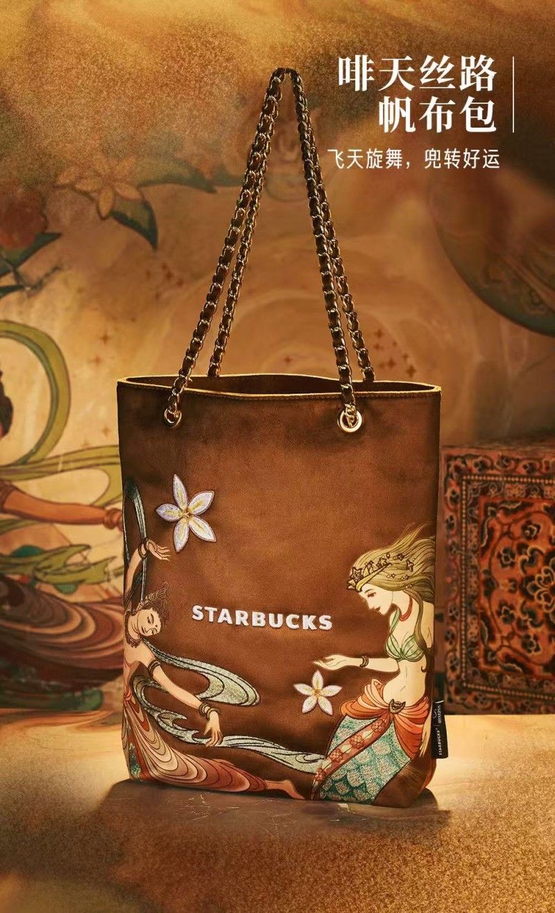“星巴克×敦煌美術(shù)研究所”聯(lián)名系列產(chǎn)品涵蓋了馬克杯、保溫杯、限定刺繡托特包、限定會員星禮包以及啡天絲路錦繩等多種品類。產(chǎn)品一經(jīng)推出,便憑借其獨特的設(shè)計理念和深厚的文化內(nèi)涵,迅速在社交媒體上引發(fā)熱議,成為眾多消費者追捧的對象。