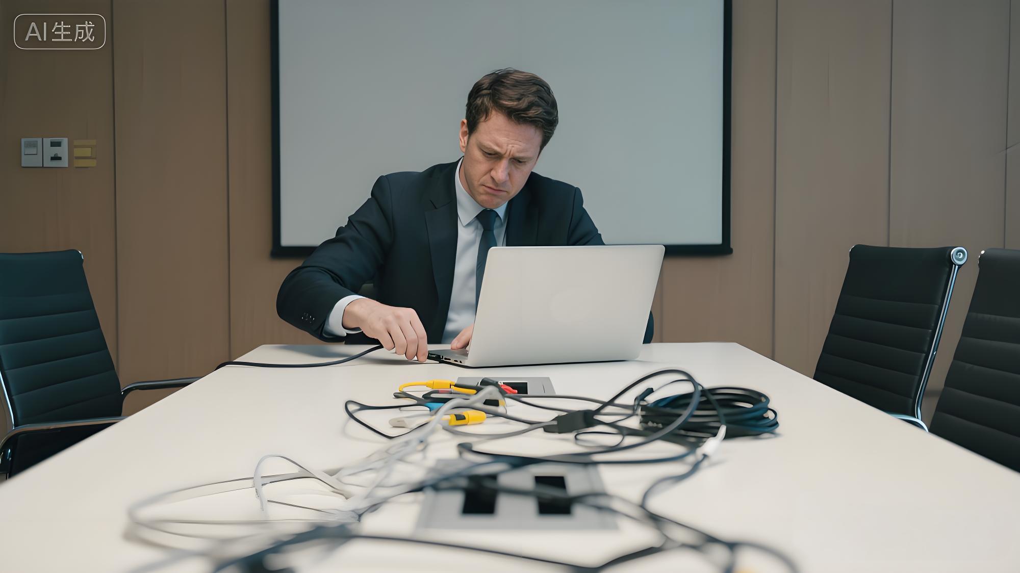 這種方式的優(yōu)勢很直觀:初期投入低,不需要專門采購復(fù)雜設(shè)備,把筆記本連上線纜就可以開啟一場會(huì)議。但劣勢也很明顯,不能滿足團(tuán)隊(duì)的擴(kuò)張需要。例如,許多商務(wù)筆記本取消了VGA和HDMI接口。如果要接入攝像機(jī)、麥克風(fēng)、顯示屏等多種外設(shè),很多筆記本的接口數(shù)量不夠,企業(yè)開會(huì)時(shí)還需要額外配備轉(zhuǎn)接頭、擴(kuò)展塢和線纜,給會(huì)議管理造成混亂。換成無線投屏后,受限于環(huán)境和傳輸速率,投屏卡頓、延時(shí)甚至中斷時(shí)有發(fā)生,也容易出現(xiàn)投屏器混用的安全隱患。看似省了錢,反而增加了企業(yè)的 “隱性成本”。