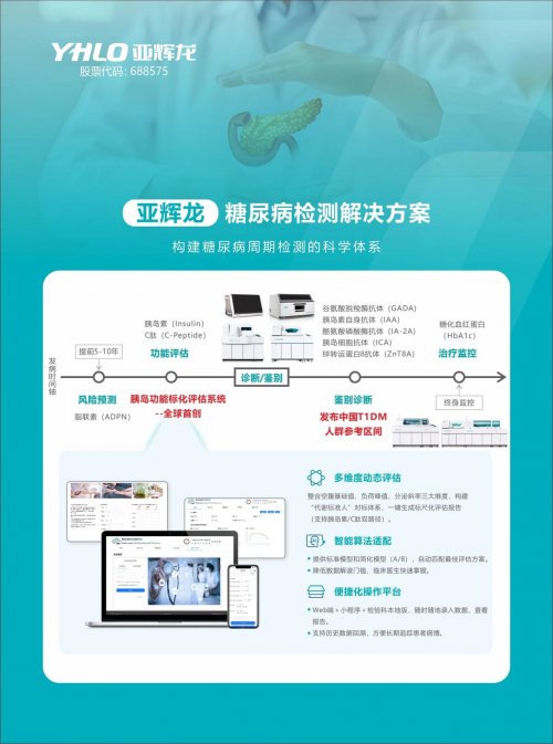 作為國(guó)內(nèi)IVD創(chuàng)新企業(yè)代表之一,亞輝龍致力于為糖尿病全病程管理提供完整的檢測(cè)方案,涵蓋風(fēng)險(xiǎn)預(yù)測(cè)、免疫分型、胰島功能評(píng)估、療效監(jiān)測(cè)等全病程: