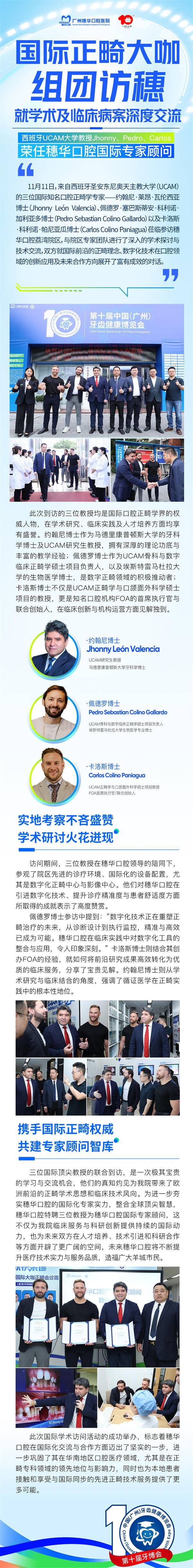 11月11日,來自西班牙圣安東尼奧天主教大學(UCAM)的三位國際知名口腔正畸學專家——約翰尼·萊昂·瓦倫西亞博士(Jhonny León Valencia)、佩德羅·塞巴斯蒂安·科利諾·加利亞多博士(Pedro Sebastian Colino Gallardo)以及卡洛斯·科利諾·帕尼亞瓜博士(Carlos Colino Paniagua)蒞臨參訪穗華口腔荔灣院區,與院區專家團隊進行了深入的學術探討與技術交流,雙方就國際前沿的正畸理念、數字化技術在口腔領域的創新應用及未來合作方向展開了富有成效的對話。