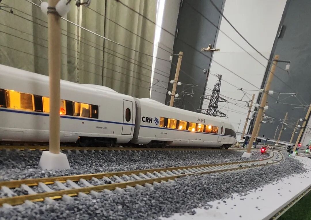 該模型不僅完整復(fù)刻了高鐵系統(tǒng)的各項設(shè)施,更實現(xiàn)了牽引供電與部分信號系統(tǒng)的功能模擬。雙環(huán)形軌道布局有效減少彎道、提升車速,車站區(qū)段甚至能夠執(zhí)行接發(fā)車操作,配合司機(jī)操縱臺,實現(xiàn)進(jìn)路辦理與信號燈同步顯示,高度貼近真實高鐵系統(tǒng)的運(yùn)行邏輯。