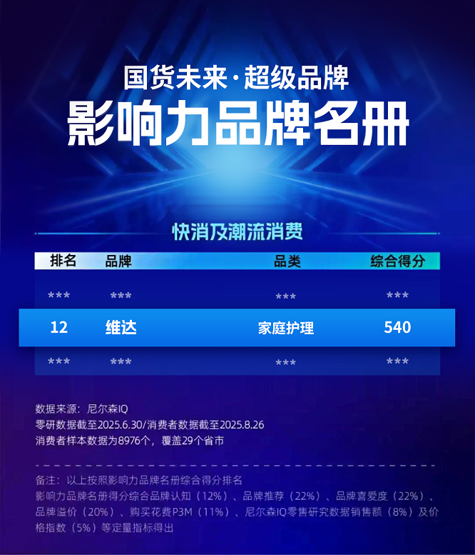 近日,全球領(lǐng)先的消費者研究與零售監(jiān)測公司尼爾森IQ聯(lián)合36氪發(fā)布“國貨未來 超級品牌”名單,維達憑借卓越的品質(zhì)根基、持續(xù)的創(chuàng)新動能與深厚的市場積淀,榮登“快消及潮流消費領(lǐng)域”全榜12名,是榜單里的首個家庭護理品牌,成為中國生活用紙行業(yè)的標桿代表。