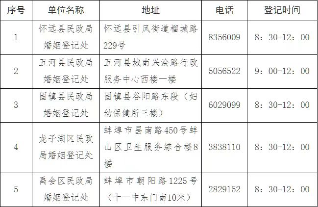 懷遠(yuǎn)縣、五河縣、固鎮(zhèn)縣、龍子湖區(qū)、禹會區(qū)民政局婚姻登記處。市城區(qū)集中在龍子湖區(qū)、禹會區(qū)民政局婚姻登記處辦理。