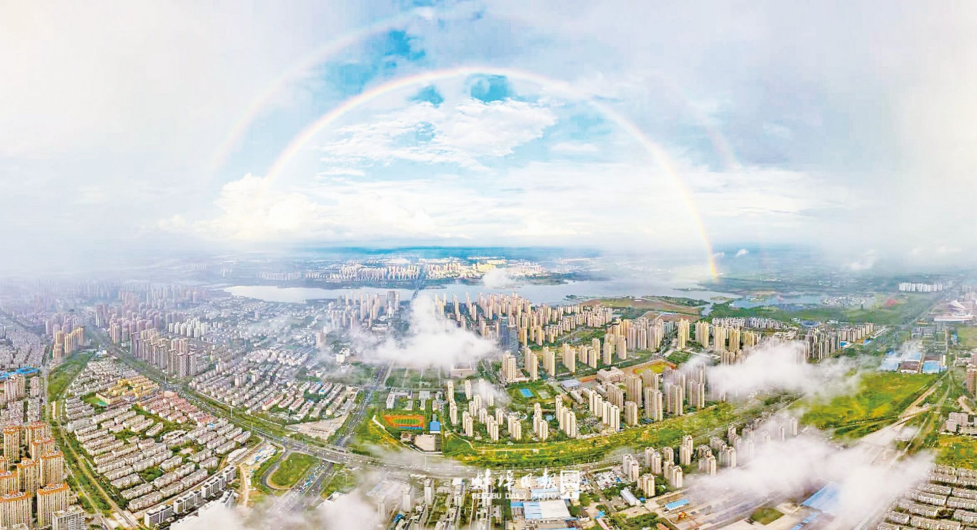 7月28日,雨過天晴的蚌埠龍子湖上空,一道絢麗的雙重彩虹橫跨天際,仿佛給龍子湖系上了兩條夢幻的彩帶,成為城市中最亮眼的風景。